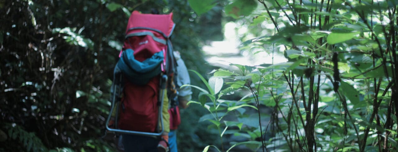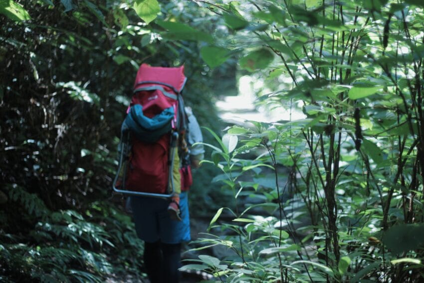 子どもは少し自分で歩いたけれど、眠そうだったのでベビーキャリーでお昼寝。担いでせっせと登る。