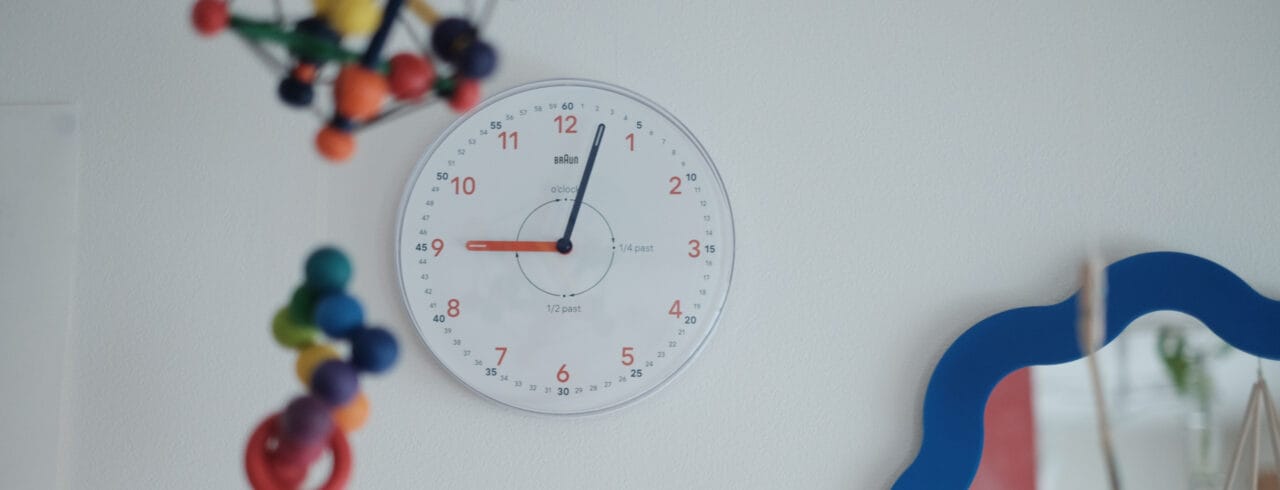 1番の(個人的な)お気に入りは、BRAUNの時計。時間の数え方、時計の読み方を楽しみながら学べるウォールクロックです。