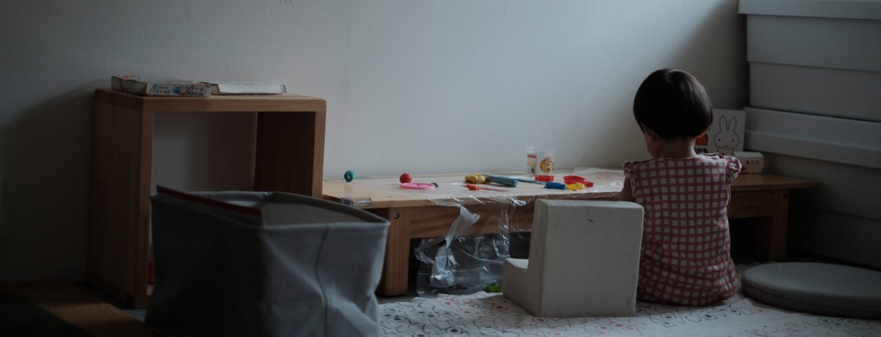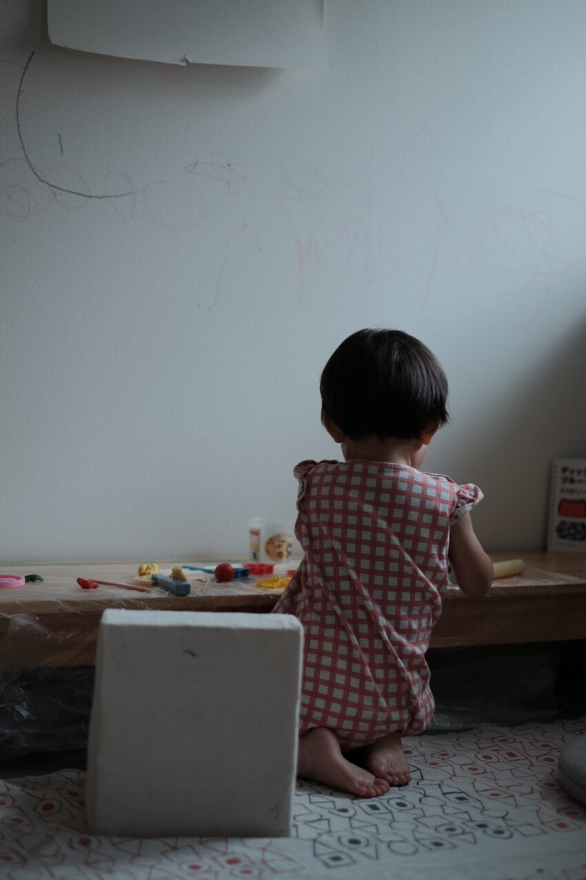 お布団と、食事をするダイニングテーブル以外のほとんどがキッズスペースなのですが(どんどん侵食されている…笑)、模様替えをして「小さなアトリエ」をつくりました。